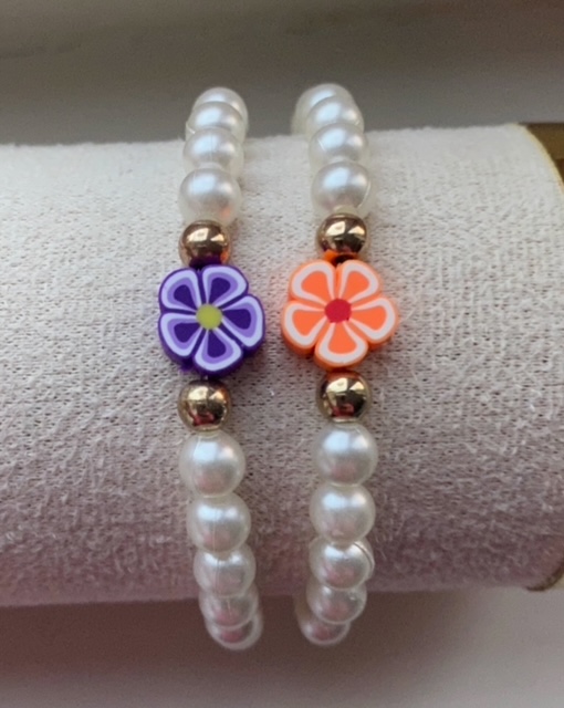 - Materiaal: Imitatieparels (of specificeer zoetwaterparels/glas indien van toepassing), polymeer kleibloem, goudkleurige kralen.