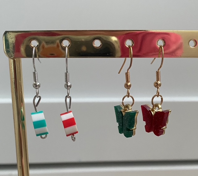 de kerst is aangekomen en ik verkoop daarom kerst oorbellen! het zijn: een rode met groene vlinder en twee rode en groene snoepjes