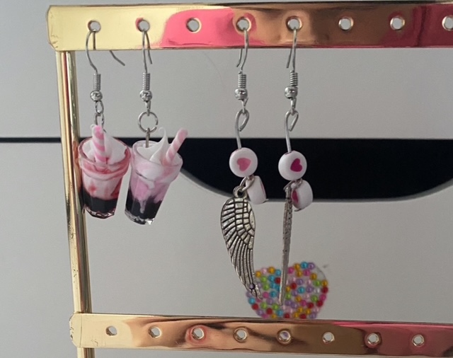milkshakes lekker maar ja dus een donkerroze en een lichtroze milkshake en twee engelen vleugels met twee hartjes